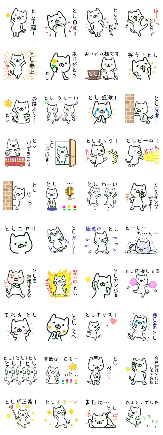 ネコのトシさんスタンプです。敏子さん、俊樹さん、利恵さん、敏夫さん、まだまだ沢山のとしさんへ。宜しければ使ってみて下さい。よろしくお願いします。