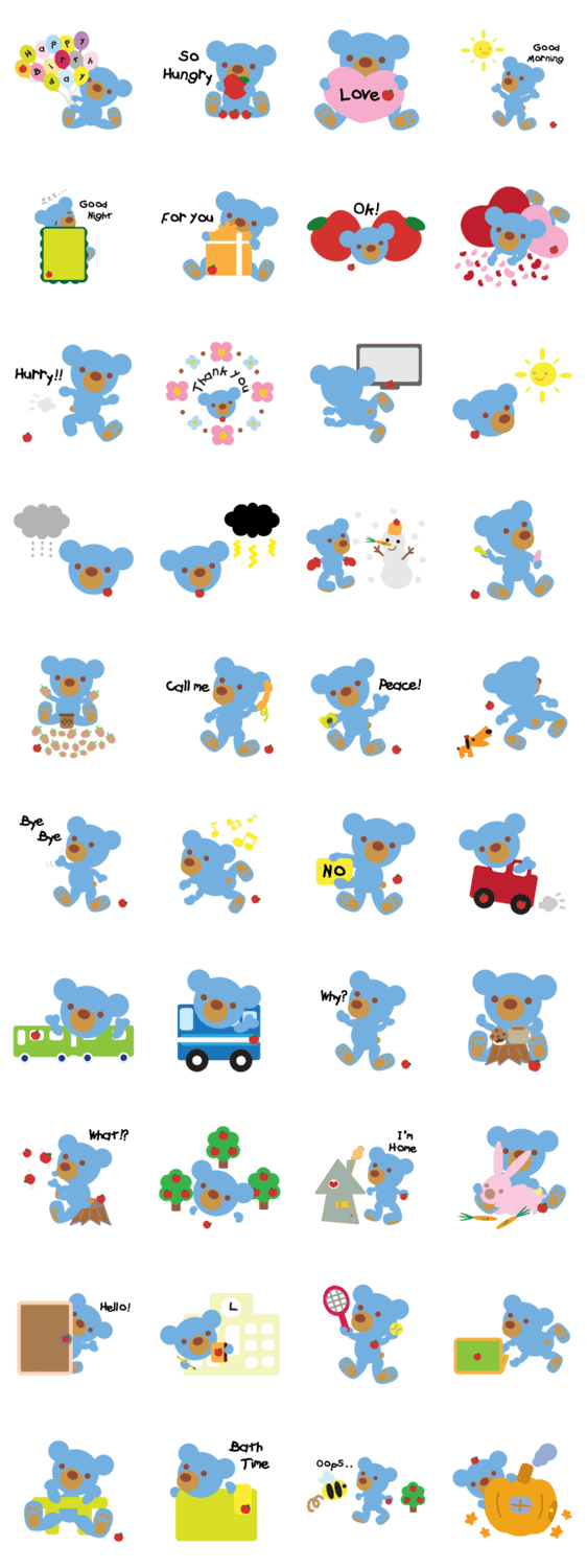 ブルーベアーのテディはりんごがだいすき。いつもりんごといっしょだよ。それぞれのスタンプのどこにあるか探してみてね。テディといっしょにチャットを楽しくしましょ。