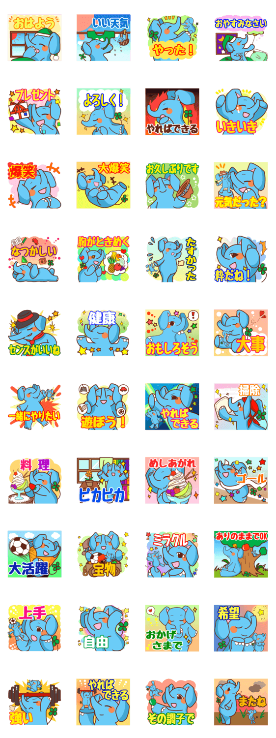 | スタンプ説明 | 幸せな世界から来たゾウ。ニコニコ笑顔。楽しい事が大好きな象さん。彼の名前はタイぞう。癒し系ゆるいキャラクター。ハッピーな動物スタンプ。挨拶、感情表現も多く便利。 |