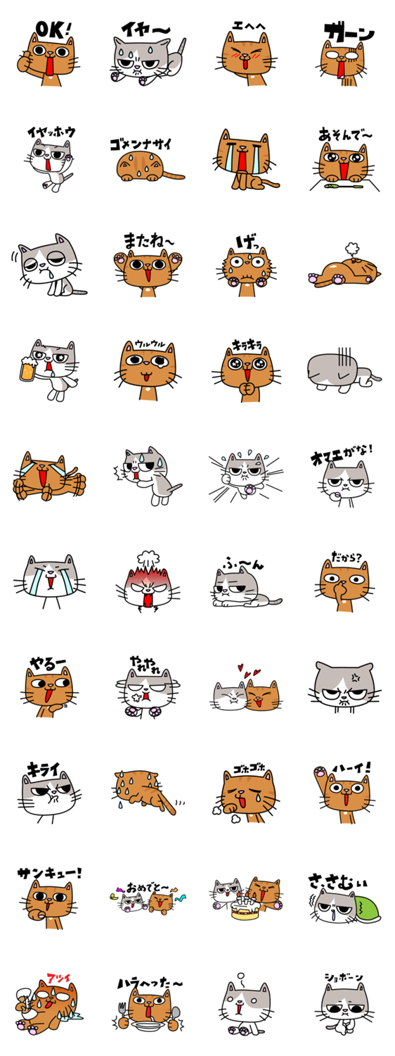 ツンデレ女子猫おこさんとちょっとおバカな男子猫ちゃーさんの仲良しコンビスタンプです