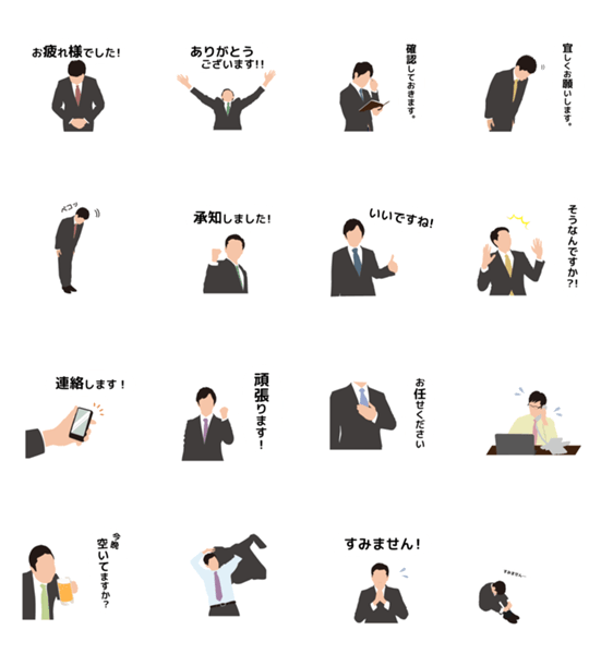スーツの男性が日常の会話に使えるスタンプ。 先輩や後輩、上司にも。