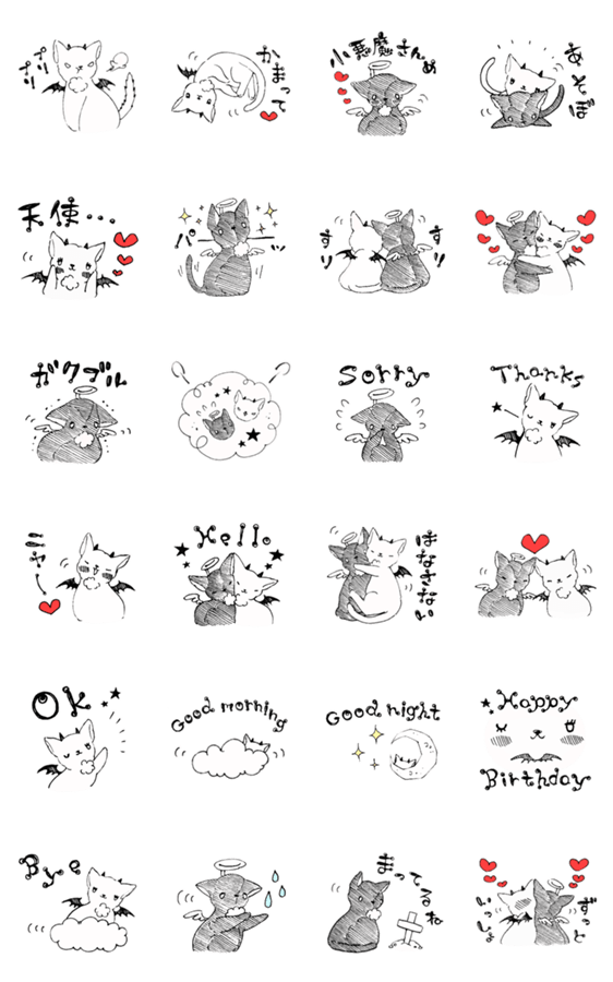 モノトーンがオシャレな黒猫天使と白猫悪魔。離れてたっていつも君のそばにいるよ。縁取り加工だから何色の背景でも見やすくて、相手にもやさしいね。スタンプ第9弾。