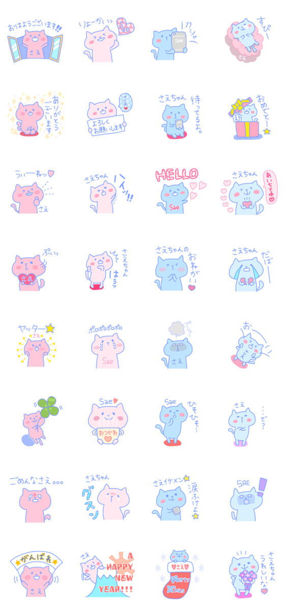 さえちゃん専用の名前スタンプです。メリークリスマスやあけおめ(a happy new year)のイベントスタンプも加えました。さえこちゃんもぜひ使ってください。