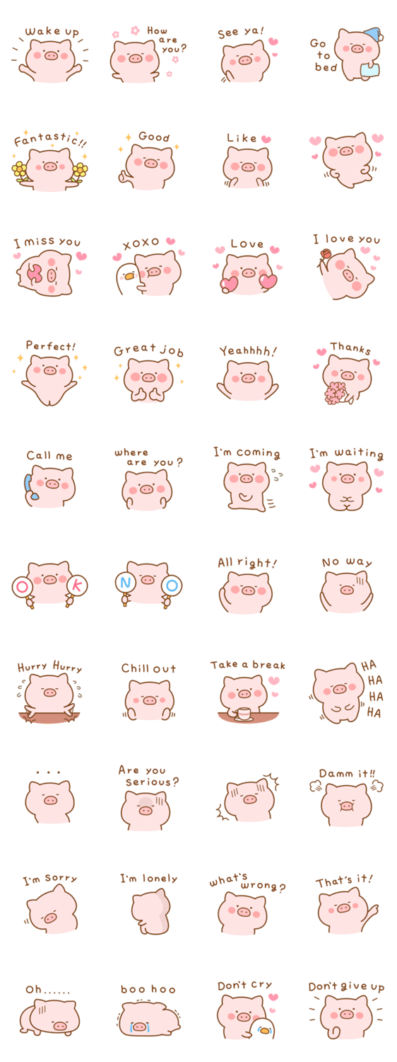 つぶらな瞳で語りかけるこぶた「ぶたたん」の英語のスタンプ第三弾です。