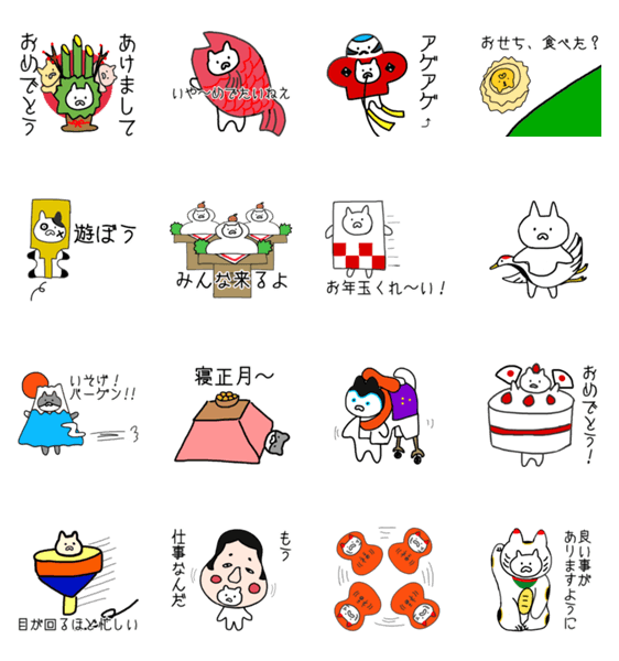 お正月・お祝いに使えるスタンプです。忙しい人もお正月休みの人もみんなで使えるよ。おめでたい着ぐるみを着た猫がいっぱい。あけましておめでとうございます。
