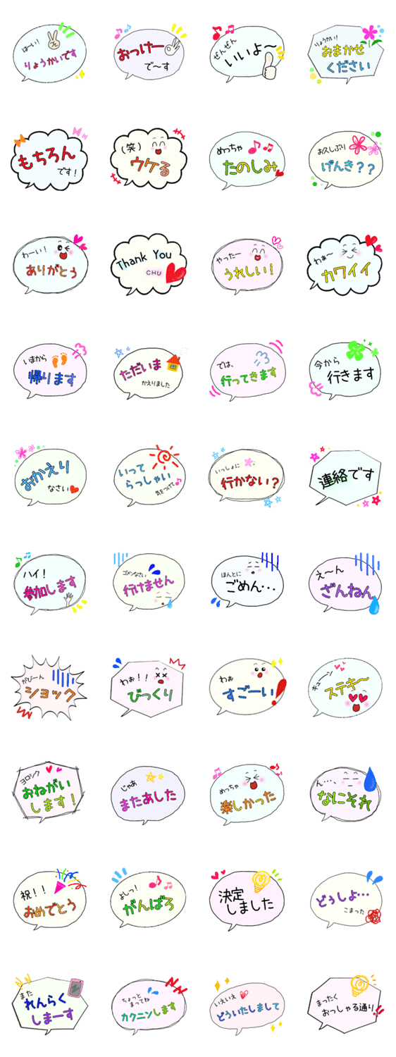 大きな吹き出し第2段、よく使う言葉。挨拶、返事。デカ文字。デカい吹き出し。シンプル。ひとことふたこと。