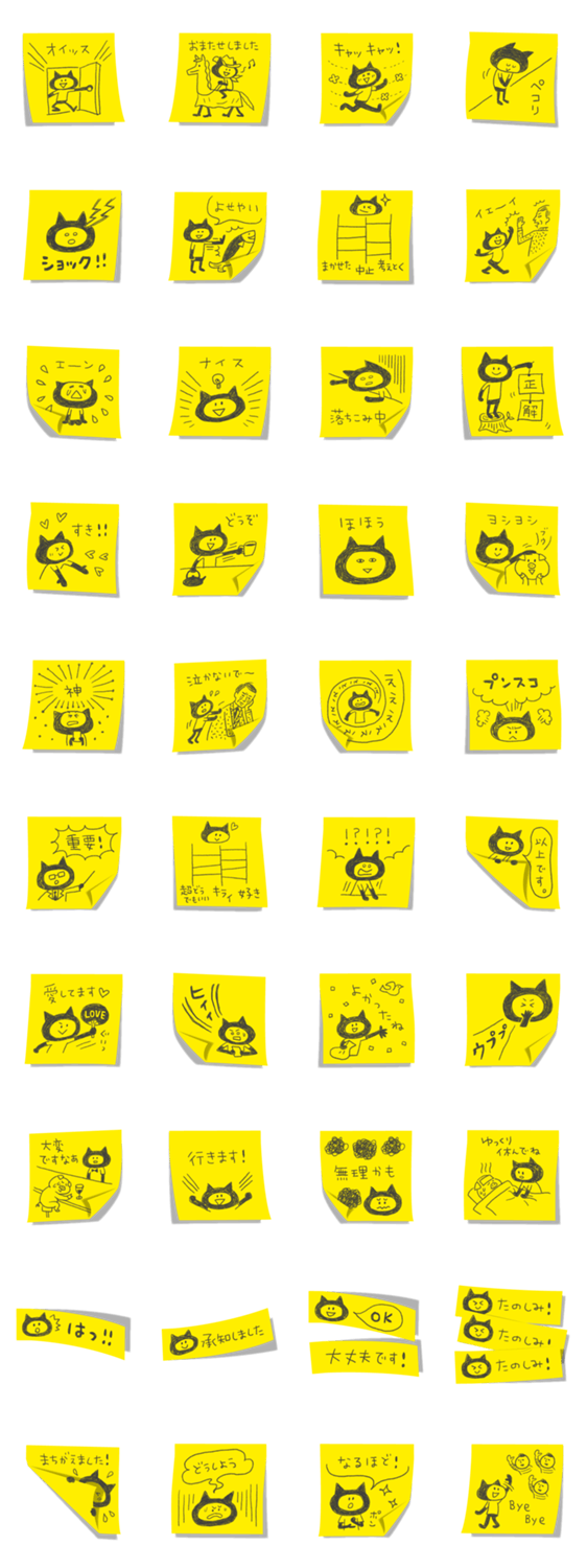 さらさらと鉛筆で書いたような、素朴な付箋(ふせん)です。影が薄くつきます。シンプルで便利なメッセージがたくさん! ゆるくてカワイイ猫のメモです。