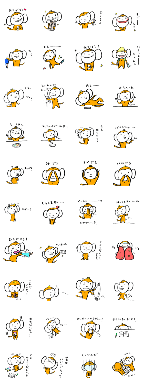 小学生のコウがおさるの着ぐるみを着て、普段よく言うちょっと面白いセリフや行動をスタンプにしました。