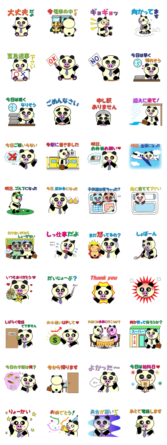 パンダと豚が合体しました。急な残業や飲み会、奥さんに言いづらい事をスタンプが代弁してくれます。