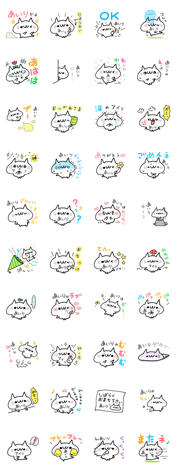 あいりさん、あいりちゃん専用のかわいい名前スタンプのねこです。40個セット。