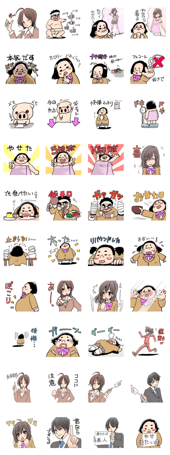 ダイエットの話題専用スタンプ、これから痩せたい人、ぽっちゃりさん、痩せ友いる人用。グループ内レコダイ、飲み会であまり食べないことを伝える時などに使ってください。