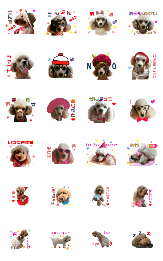もふもふふわふわのかぶり物大好きなトイプードルのらぶちゃんとお友達のココちゃんのスタンプです☆