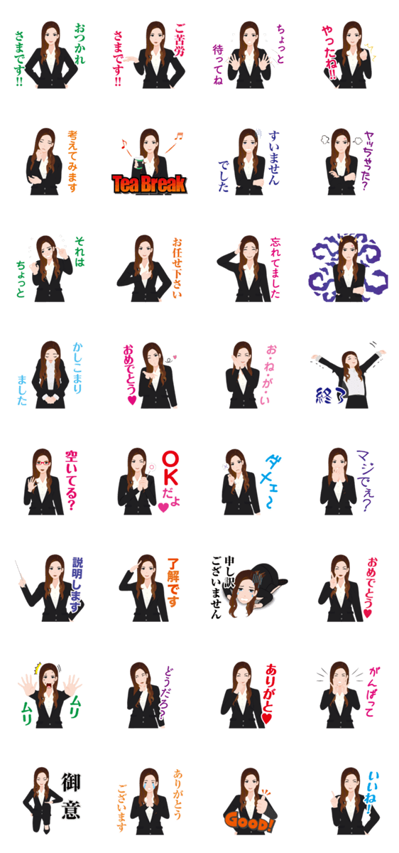 仕事、ビジネス、日常で使える言葉中心です。働く「オトナ女子」のためのスタンプです。