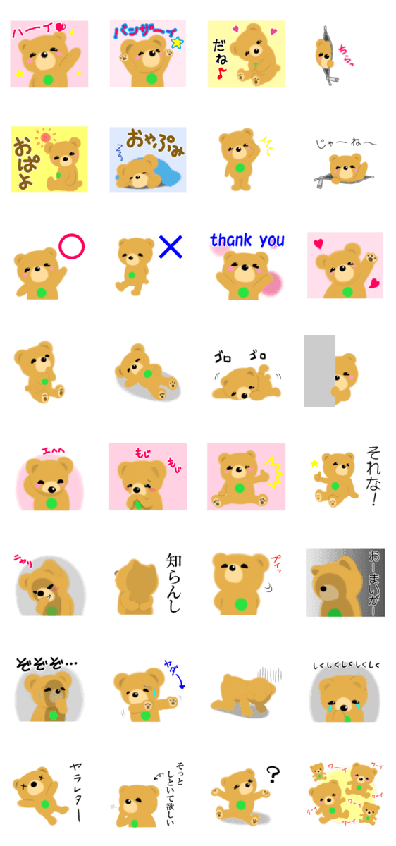 かわいいクマのぬいぐるみのようなスタンプです。おなかにある緑色の模様がまりもみたいなので、まりもっくまちゃんなのです。
