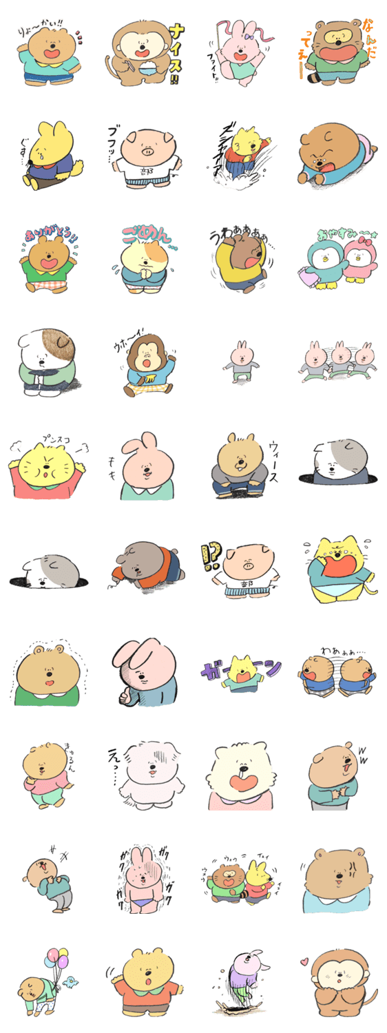 おとぼけた動物たちのゆるいスタンプ。くま、うさぎ、ねこ、色々いるよ♪