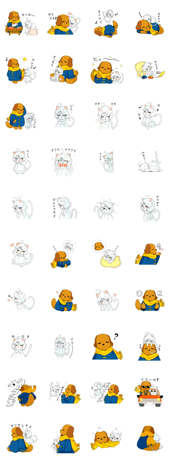 大きな犬のジョンくんと小さな子猫のミミちゃんの仲良しスタンプです。