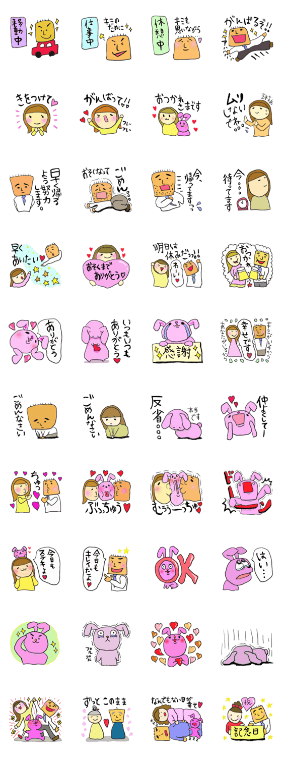 夫婦や恋人の日常で使えるスタンプです。ぬいぐるみのうさぎも一緒に気持ちを伝えます。ゆちゃこのスタンプ第三弾。