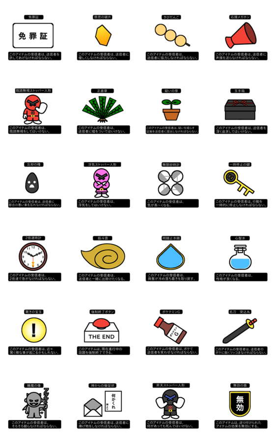 誰かに送り付けたくなるシンプルデザインのアイテム第1弾です。※アイテムの効果は受信者によって個人差があります。アイテムのご使用は、自己責任でお願いします。