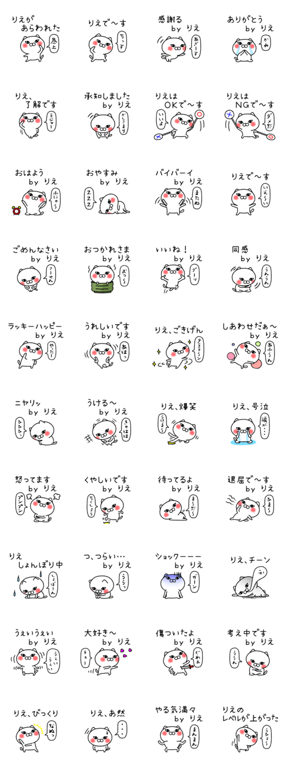 理恵、理絵、利恵、利絵、梨江…、全国の「リエ」さん専用の名前スタンプです。猫キャラ仕様、日常会話の基本セットです。「ちゃんねこシリーズ」です。