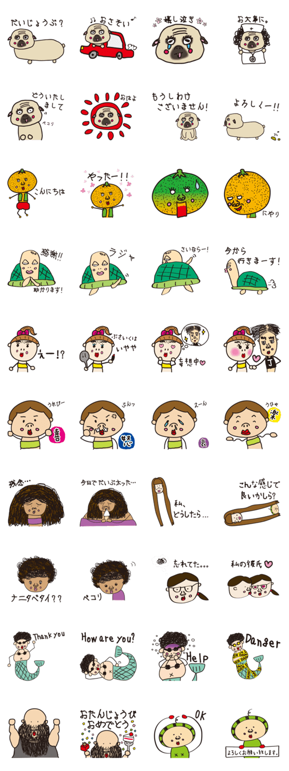 コマツ画伯が描いたイラストスタンプ★登場人物はパグ犬、みかんクソ野郎、カメ、フルカワ、ともちん 、きいか、ゆーりん、りゅうたろ、しーちゃん、人魚などなどです!
