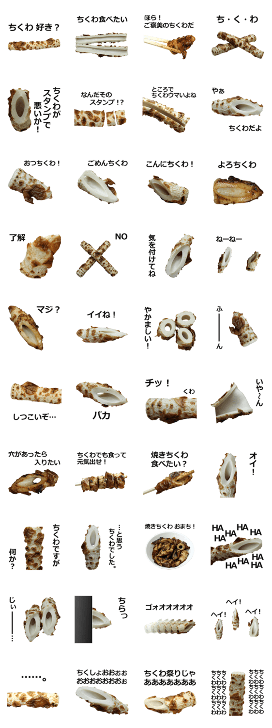 ちくわの実写スタンプです。一眼レフで撮影した超高画質竹輪(チクワ)をどうぞ!飯テロにもどうぞ。40個入り。