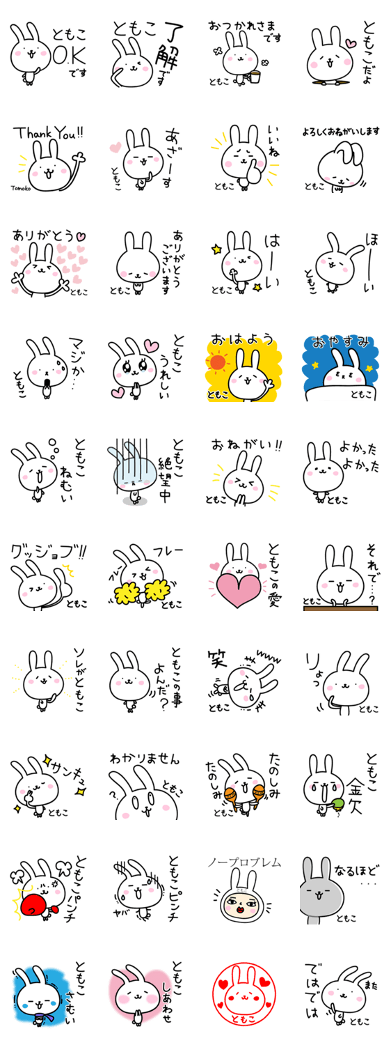 ともこ専用のゆるいウサギです。自分専用の名前スタンプでトークを盛り上げよう☆
