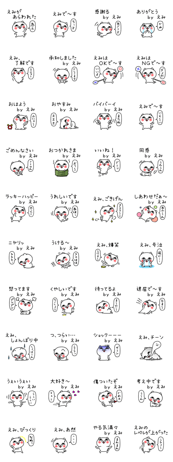 恵美、絵美、映見、映美…、全国の「エミ」さん専用の猫キャラ名前スタンプです。日常会話の基本セットです。「ちゃんねこシリーズ」です。