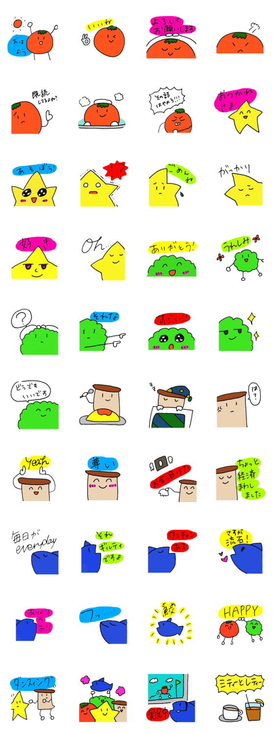 キノコとトマト、まりも、お星、サメはある大学の同回生。大学生のうぇーいノリの使いやすい?スタンプです。それぞれ違うけど、キノコはそんなみんなのことが大好きだよ♡