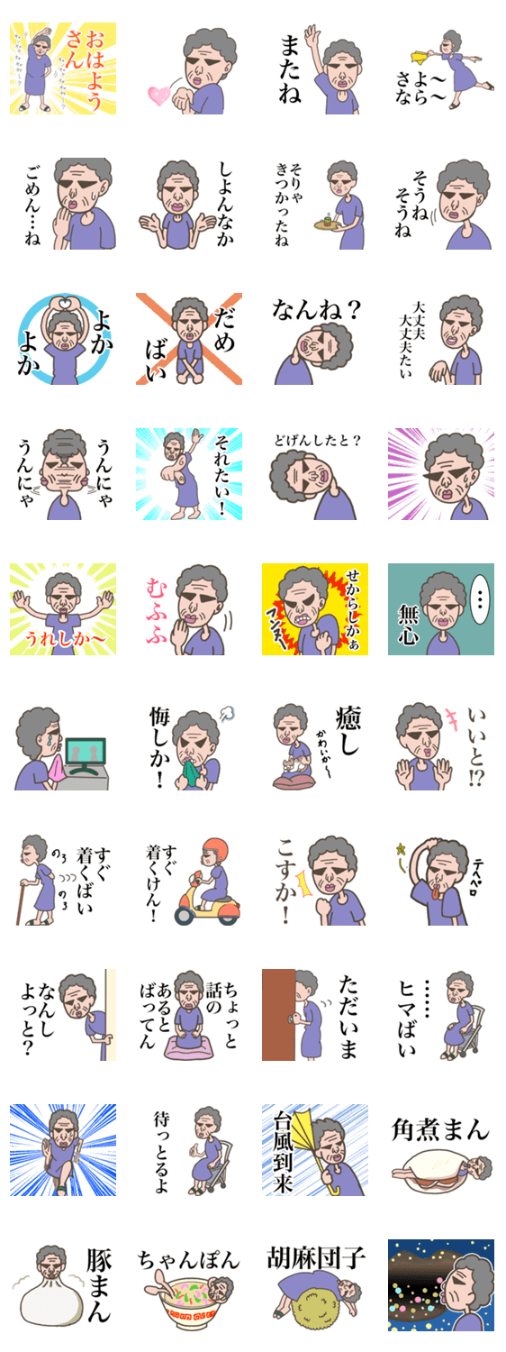 実の祖母がモデルの長崎弁スタンプ!基本&長崎名物を集めました!おばあちゃんだって若い人らに負けてない!ちょっとシュールなスタンプ是非使ってください。