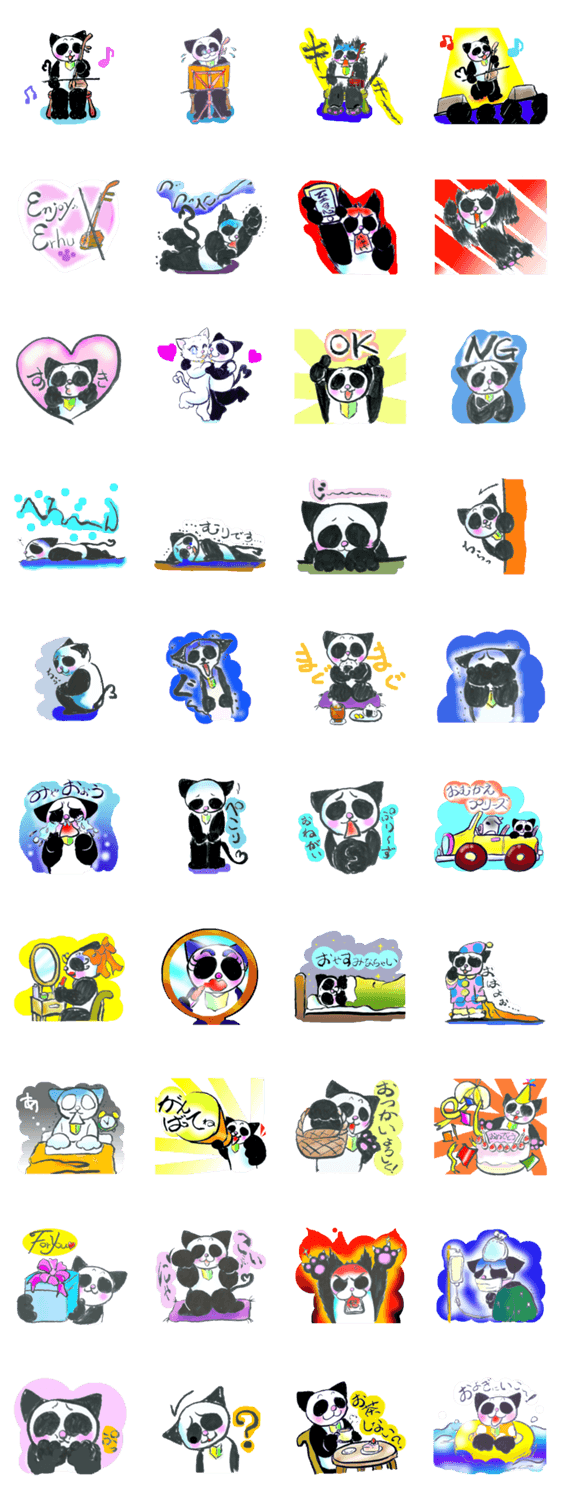にゃこちゃんは、二胡が好きなネコ。(パンダじゃないよw)顔の柄の割には表情豊かなにゃこちゃんの、日常と二胡に使えるスタンプ!