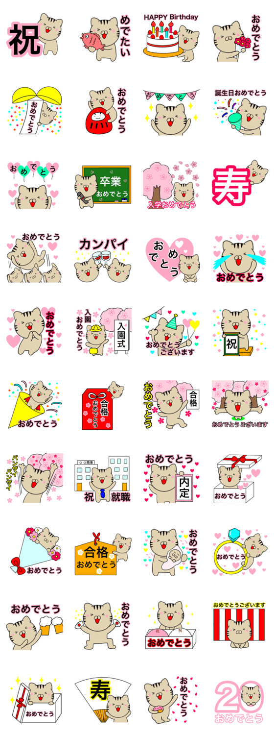 いろんな おめでとうを40個集めたスタンプです。 誕生日やお祝いと めでたい時に使えます。