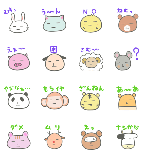 スタンプ名どおり無表情なアニマルたちです。愛想なしデス。