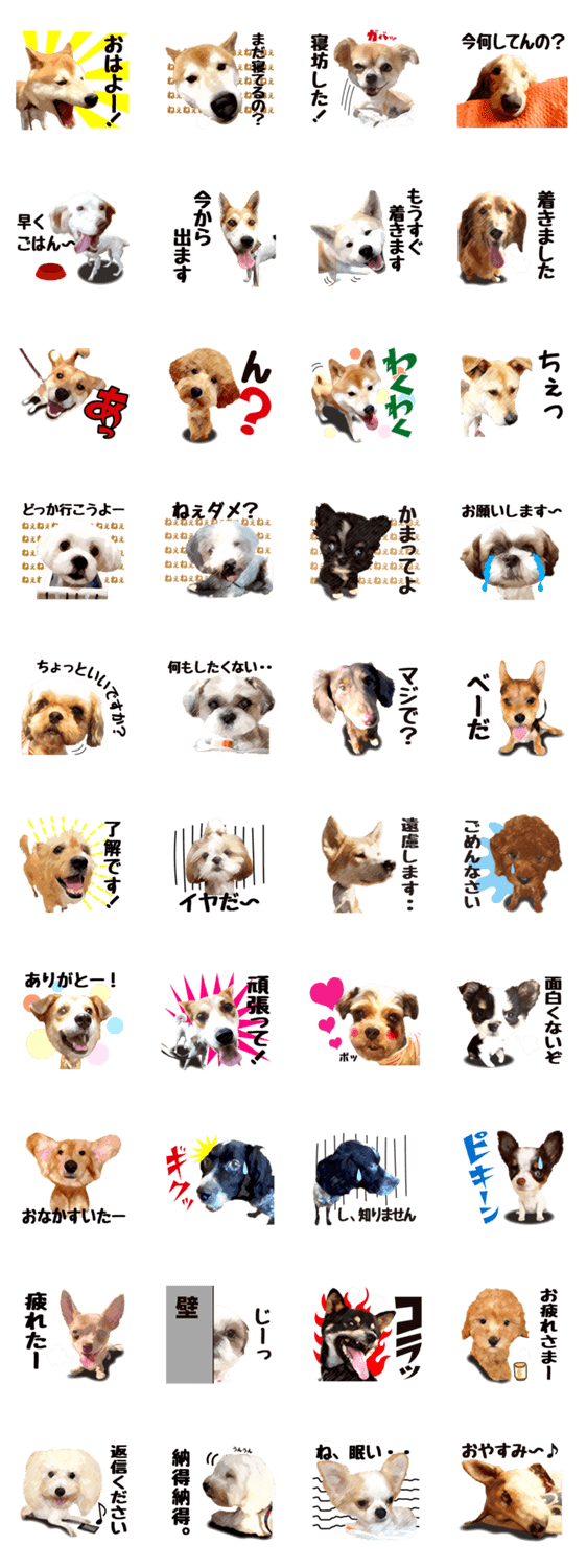 このスタンプはみんな動物保護団体に救助されたワンコたちです。保護犬はみんなこんなに可愛い子たちなんです。ペットショップに行く前に保護犬の譲渡会に行きましょう!