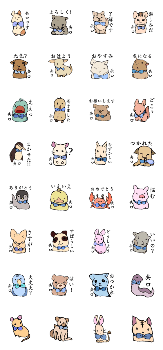 矢口さんが使える専用のスタンプです。青いリボンの動物たちが矢口さんの気持ちや言葉を表現します。