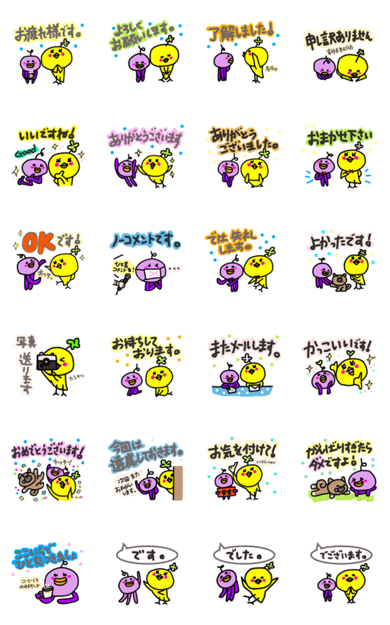 ピヨ吉とその仲間のほのぼの劇場第二弾。使いやすい敬語シリーズです。あと、お手持ちのスタンプに組み合わせて敬語になる、ふきだしもあります。