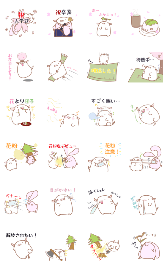 ぶたぽんの春用スタンプです。 春の行事などが入ってます。 花粉症に困ってる方におすすめです。