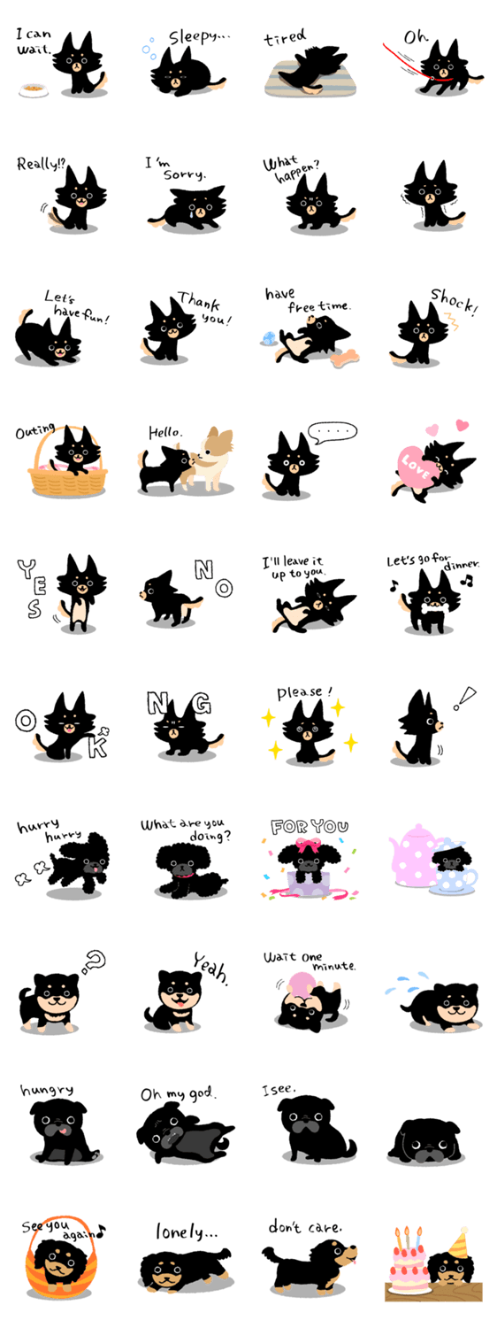 チワワの「ロボ」とトイプードル、豆柴犬、パグ、ダックスのスタンプです。黒わんこと一緒に遊ぼう!paricoのスタンプ第6弾の英語版です