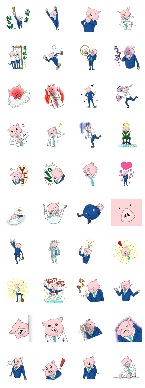 遅刻しそうな時は走って、仕事が上手くいかない時はヘコんで飲んで。それでも頑張る!そんなサラリーマンの日常を切り取ったスタンプです。まぁ、ブタなんですけどね。