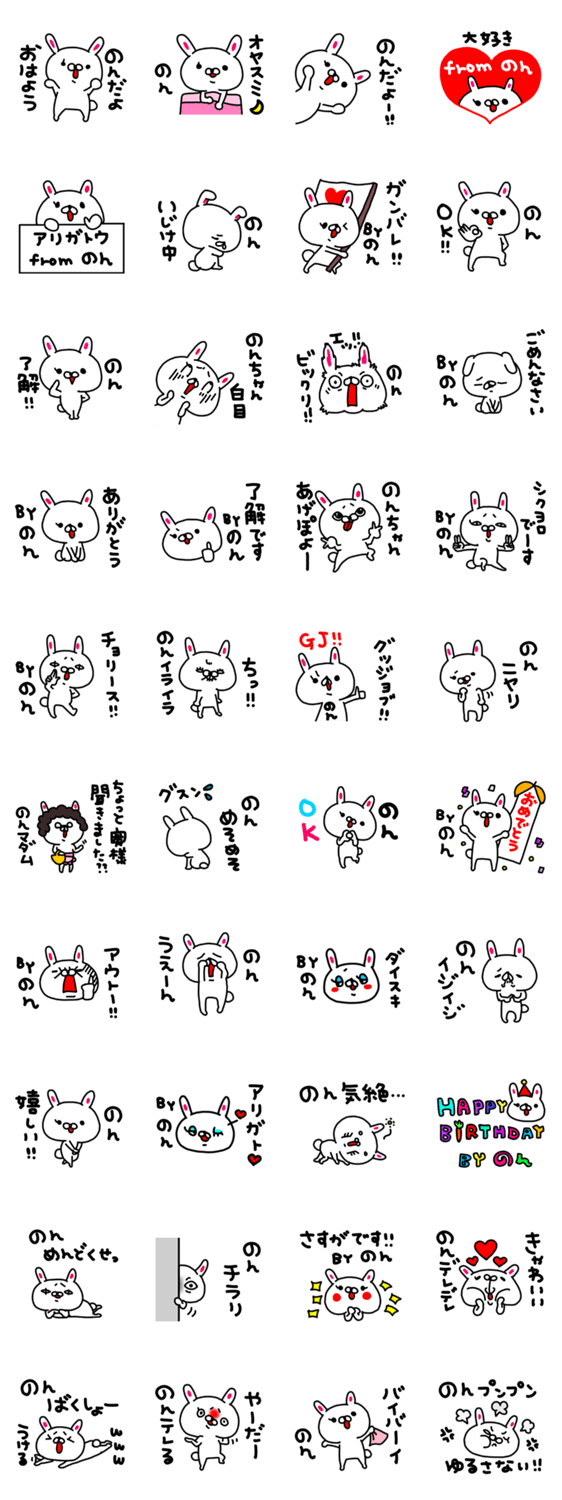 のりこ、のりお、のりみ、のぞみ、のぞむ、のむら、ののむらなど「ノンちゃん」と呼ばれている人のスタンプ。かわいいうさぎと日常会話で使いやすい。