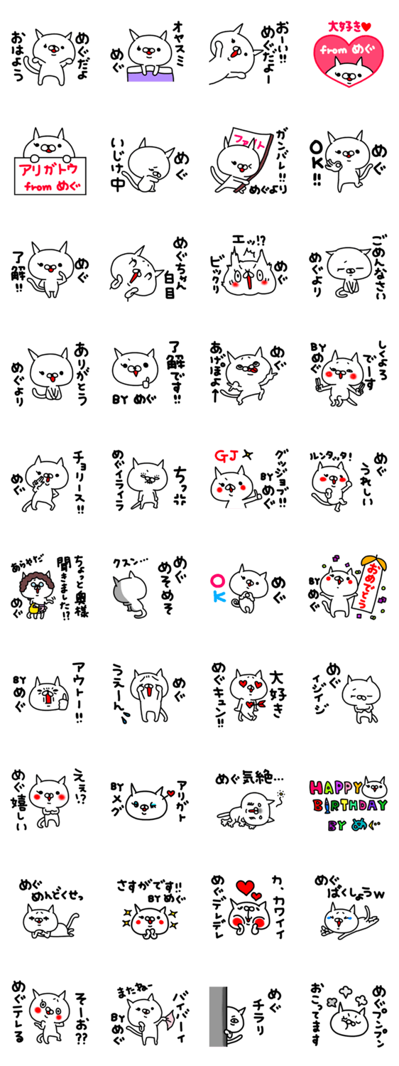 めぐみちゃん、めぐむちゃん、めぐるちゃん、恵さんなど「めぐちゃん」と呼ばれている人のスタンプ。かわいいねこと日常会話で使いやすい。