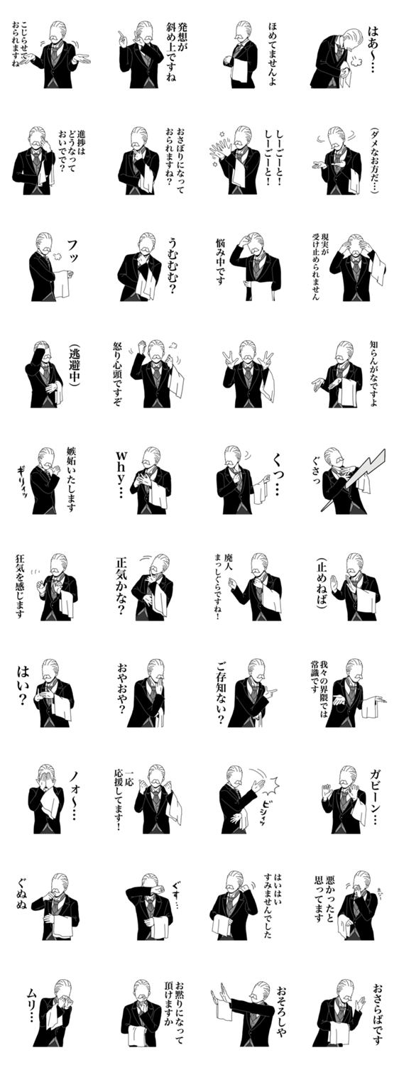 「全てを否定する執事」の第3弾です。 「全てを肯定する執事」の派生スタンプです。引き続き愛のある否定をする際にお使い下さい。