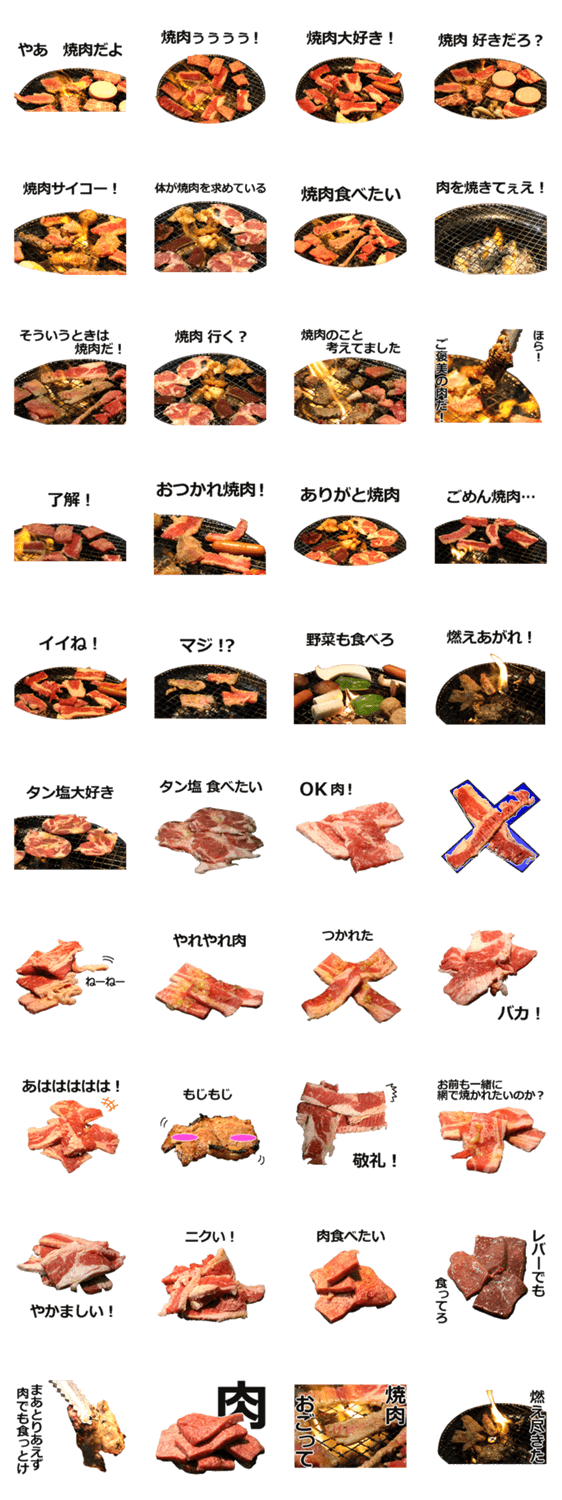 みんな大好き、焼き肉の実写スタンプです!飯テロにも効果抜群です。生のお肉もあります!お肉大好き♪40個入り。