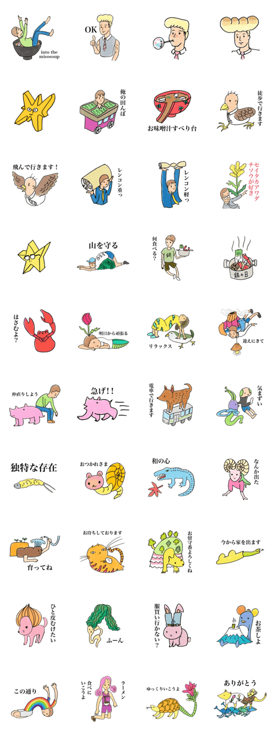 毎日のお味噌汁にちょこっと工夫をするだけで、世界がこんなにもワクワクでいっぱい!そんなキモカワ・シュールな仲間たちのスタンプです。