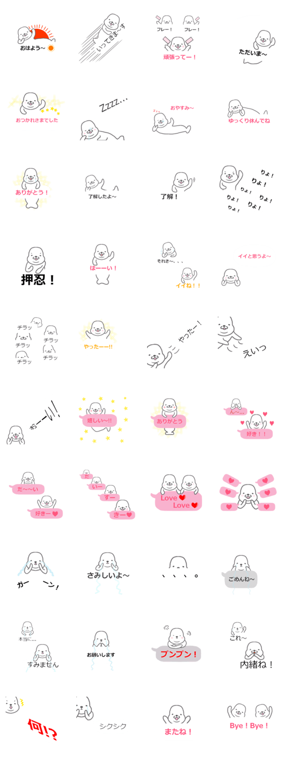 可愛いあざらしの吹き出しトークスタンプです。日常で使いやすい言葉が多いです。
