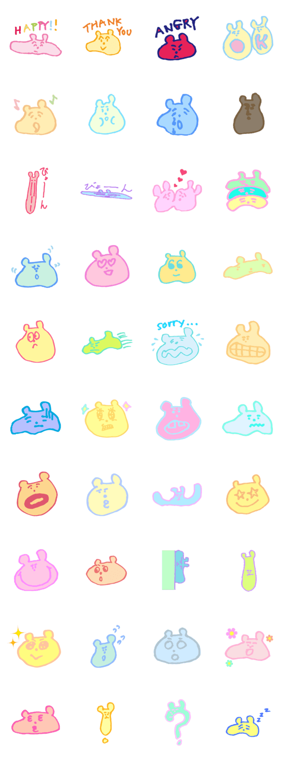 自由自在に形をかえるぺたぺたぷにぷにするクマ、ぺたくま♪既読でも晴れでも雨でも嵐でも関係な〜い!マイペース♪手描きでゆる〜く癒される個性豊かで憎めない表情だよ♪