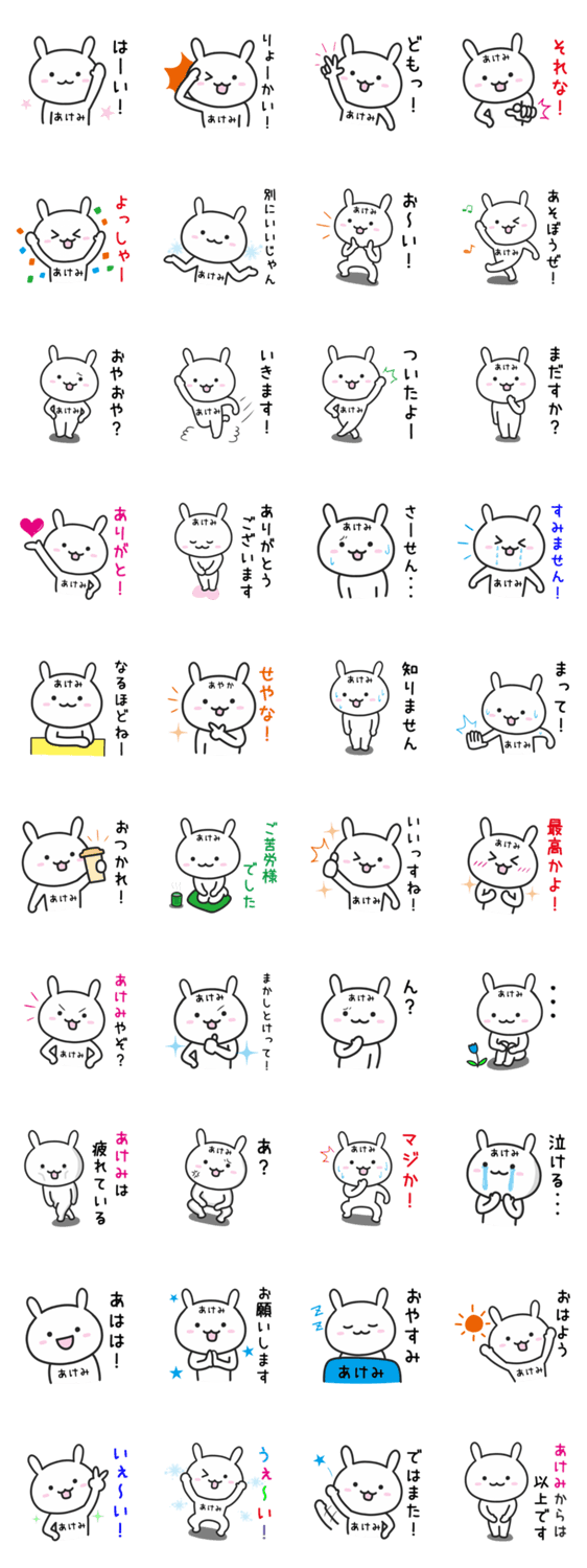 名前が「あけみ」の人が使えるうさぎの名前スタンプです。明美、朱美、明海、朱未、暁美、あけ美、明心、明未、珠美、アケミさんなどに。挨拶や返答に使える基本セットです