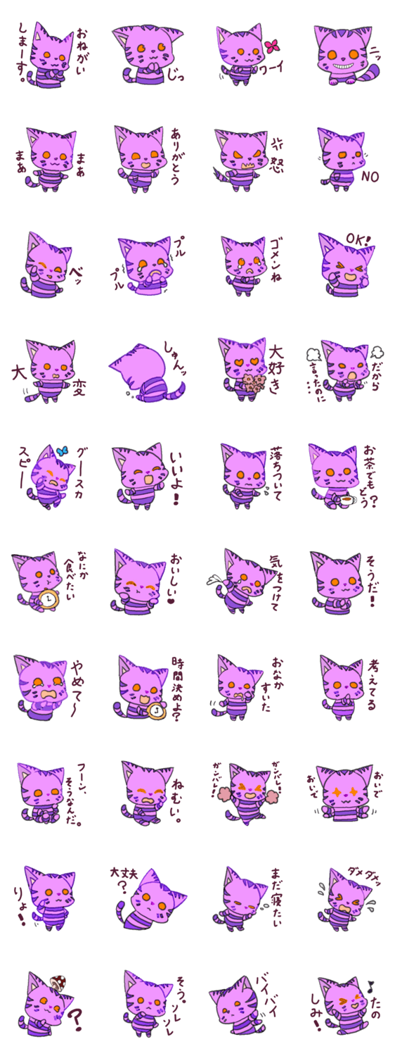 不思議の国のアリスで有名なチェシャ猫を元にして描いた子猫のスタンプです。日常会話で使えます。