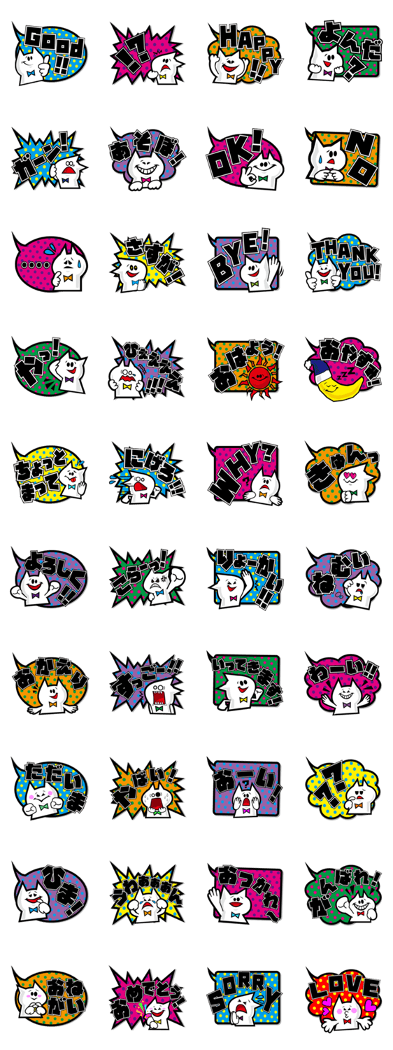ポップでカラフルな白ネコの吹き出しスタンプです。日常会話で使いやすく、派手でインパクト抜群!アメコミ風の猫がとってもキュート!
