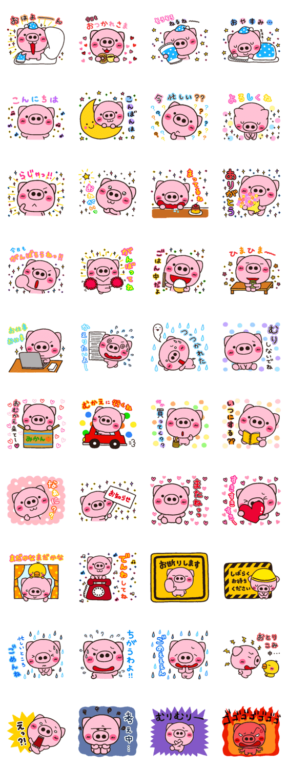 おはよーからおやすみまで使えるのブタの日常スタンプです。前回人気の高かったもの中心にすべて新しく描き直しました。