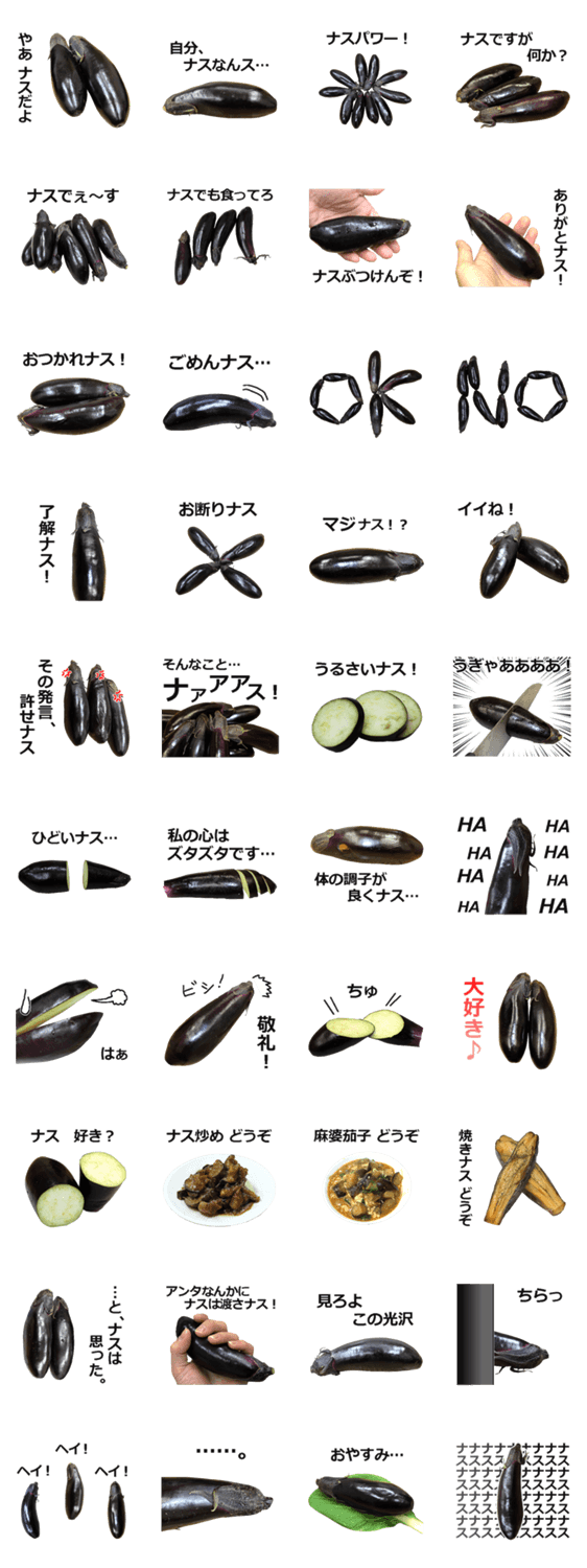 茄子の実写スタンプです。ナスの見た目って面白いですよね。一眼レフカメラで撮影した超高画質ナスをどうぞ♪飯テロにも。野菜大好き!40個入り。